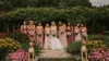 Group of nine women in bridesmaid dresses standing outdoors with a bride, all holding bouquets, surrounded by colorful flowers and garden statues. View fullsize
