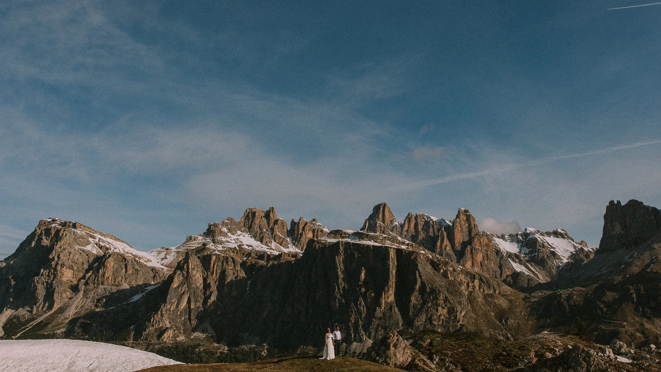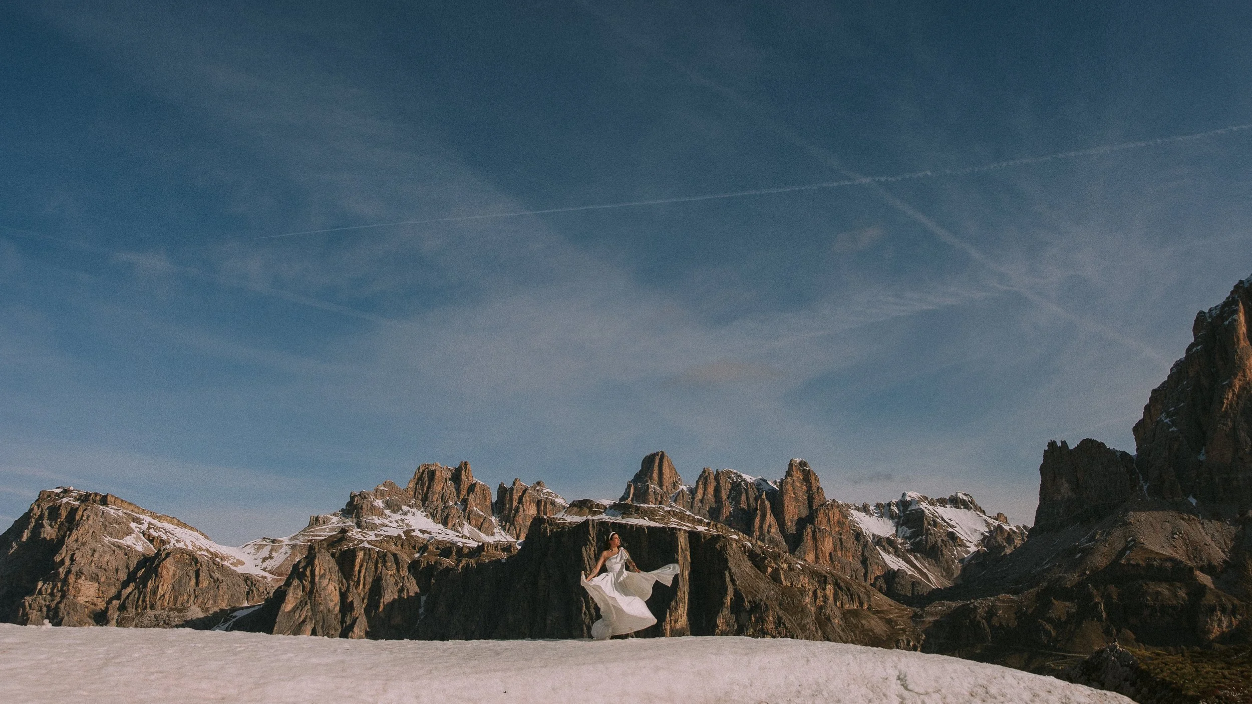 A woman in a flowing white dress standing on snow-covered ground in front of rugged mountains with some snow on peaks, under a blue sky with wispy clouds and contrails. View fullsize