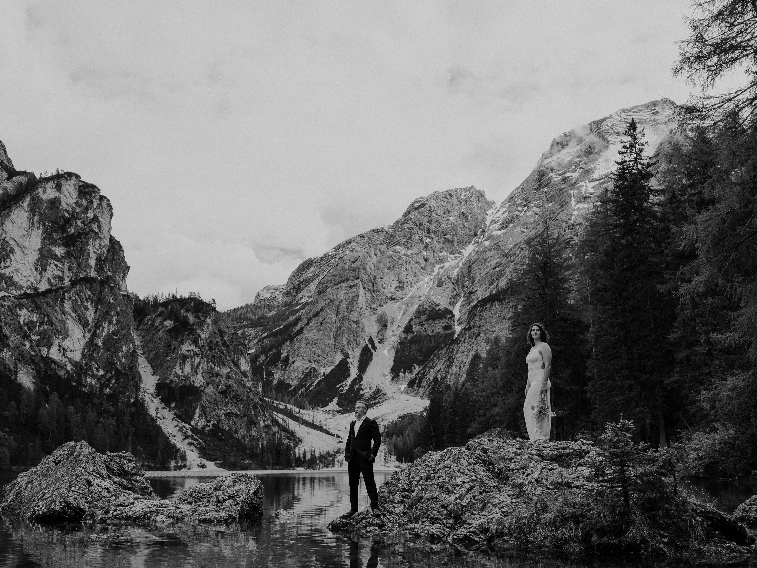 A black and white photo of a man in a suit standing on a rock in a lake, with a woman in a long dress standing on another rock nearby, surrounded by tall trees and mountains. View fullsize