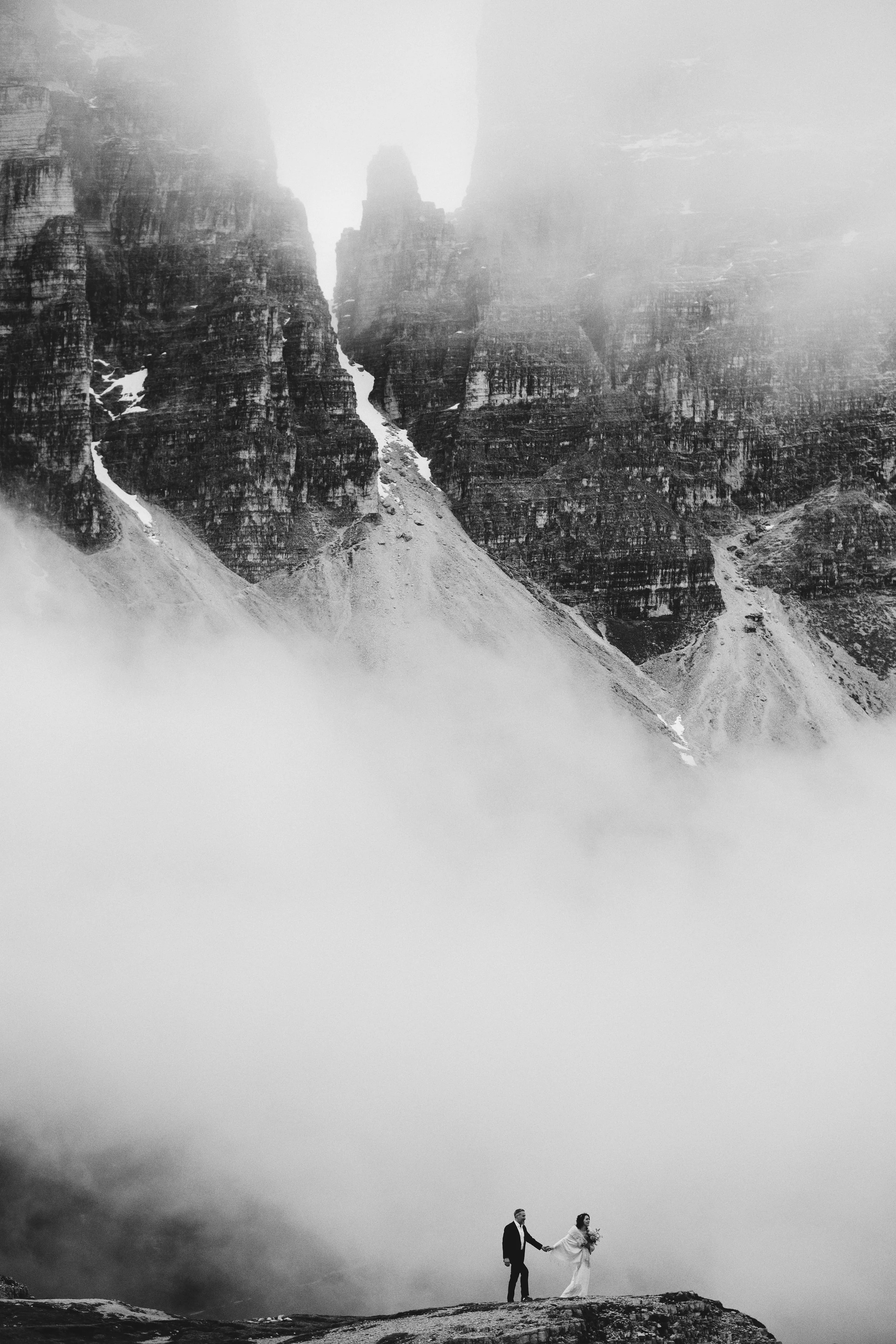 Black and white photo of a couple holding hands on a rocky ledge with a mountain range and fog in the background. View fullsize